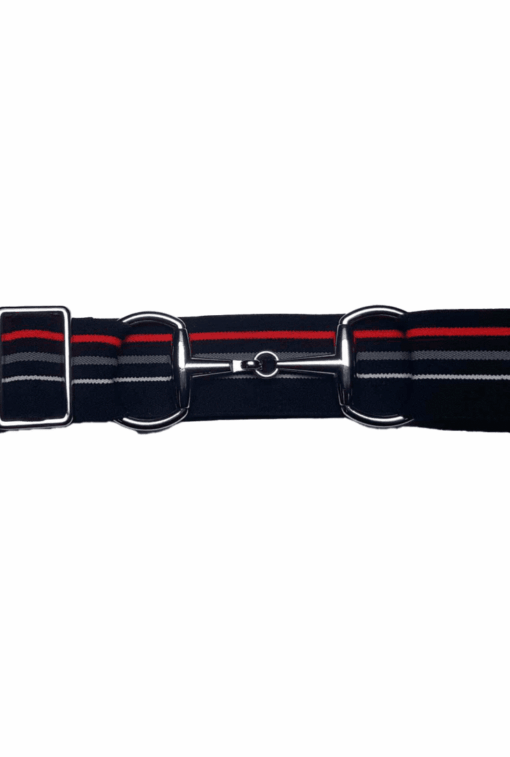Black, red, gray and white striped elastic with silver buckle as a bit