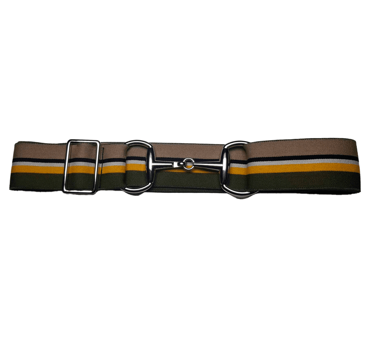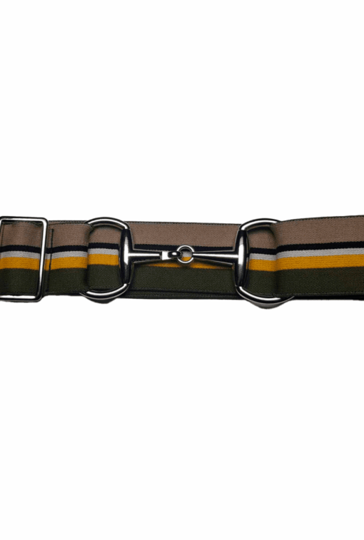 Green, yellow, white, black, beige striped elastic with silver buckle as a piece