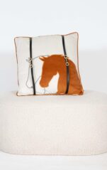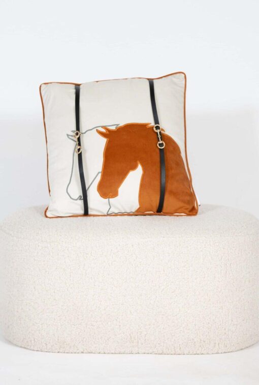 This unique pillow features a detailed stitched horse head in a beautiful design that captures the essence of the horse's grace and strength. On the front of the pillow, two faux leather straps run down the front, onto which a gold bit is mounted - a stylish detail that pays homage to the world of the rider and gives the pillow an exclusive look.