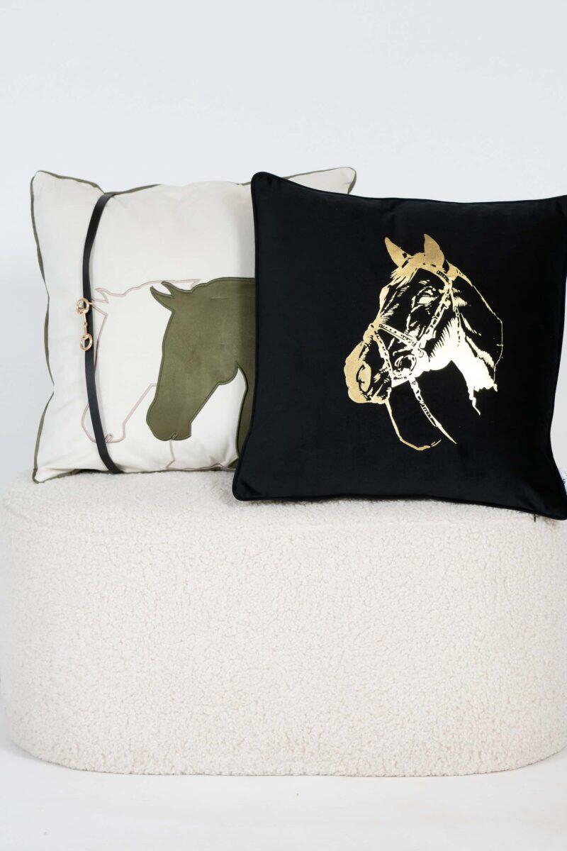 The center of the cushion is adorned with a detailed golden horse head print that captures the beauty and grace of the horse. This refined detail brings a timeless elegance to any space and celebrates the majestic nature of the horse