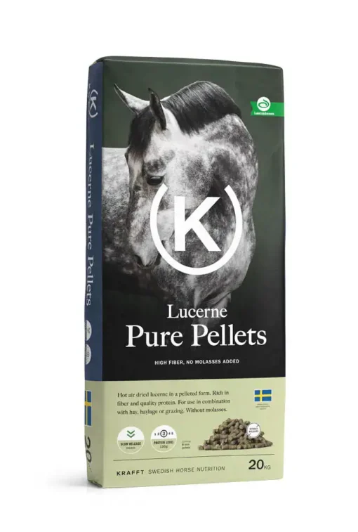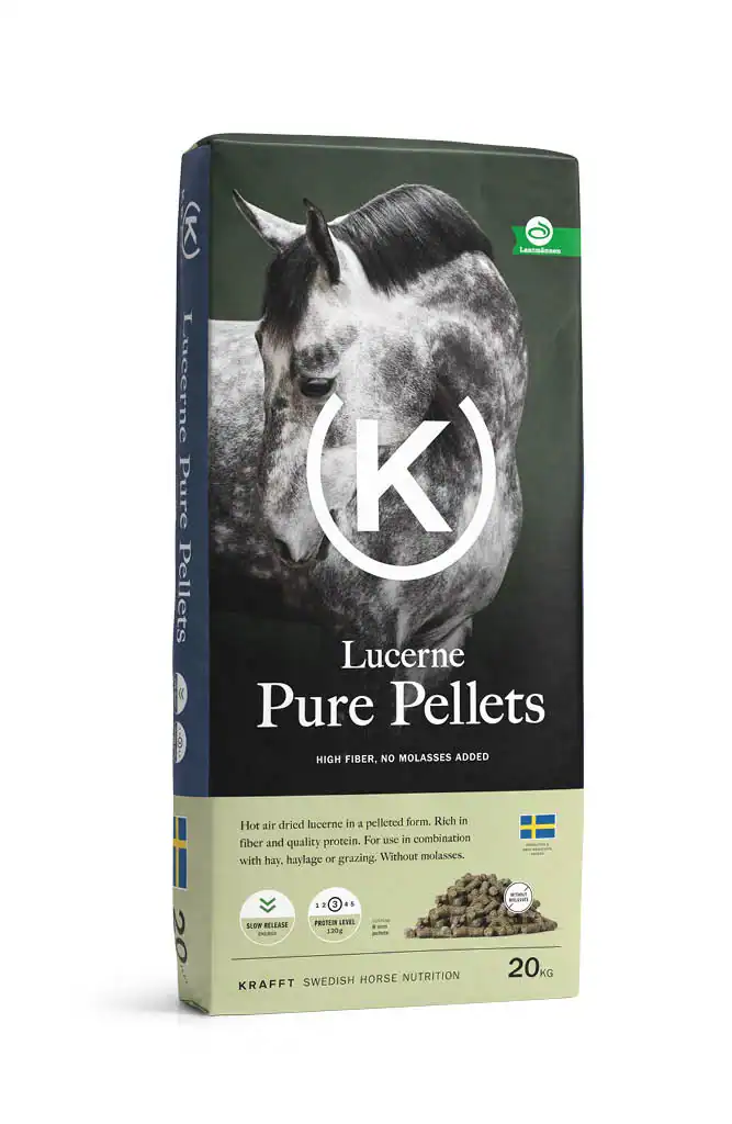 Lucerne Pure Pellets are hot air dried alfalfa in pellet form without added molasses. Used as a supplement to hay, wrap and/or grass. Rich in high quality fiber and protein, as well as a balanced composition of other important nutrients. The high fiber content promotes healthy colon function and supports digestion.