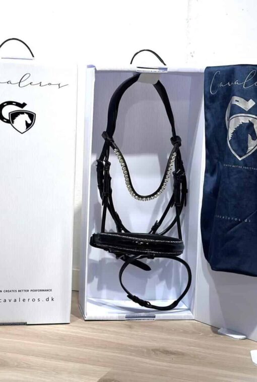 • Black lacquer with black crystals and black lining on the noseband and round-stitched ratchet strap