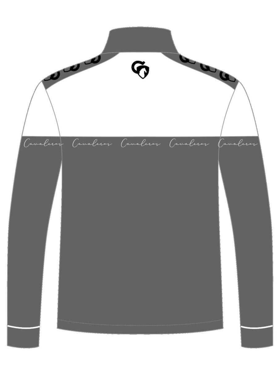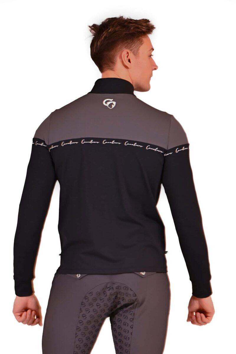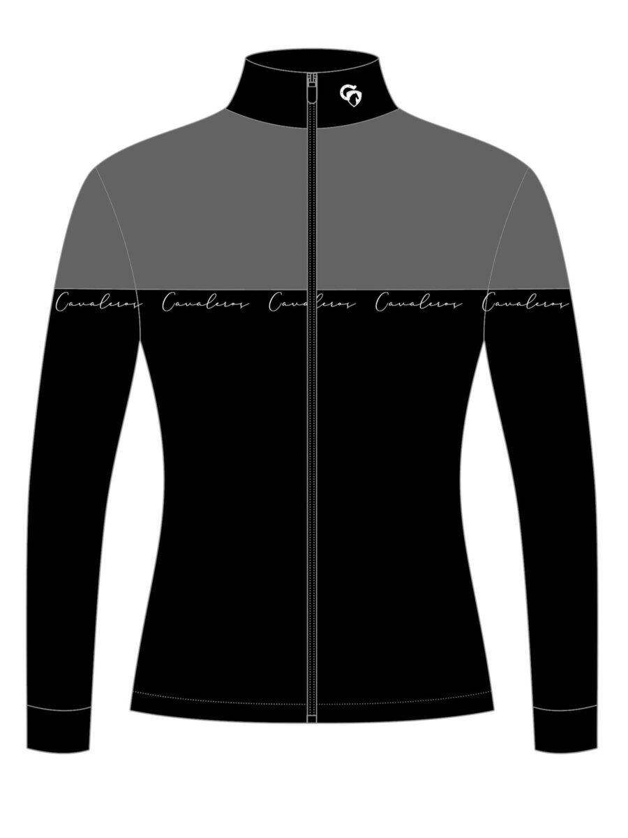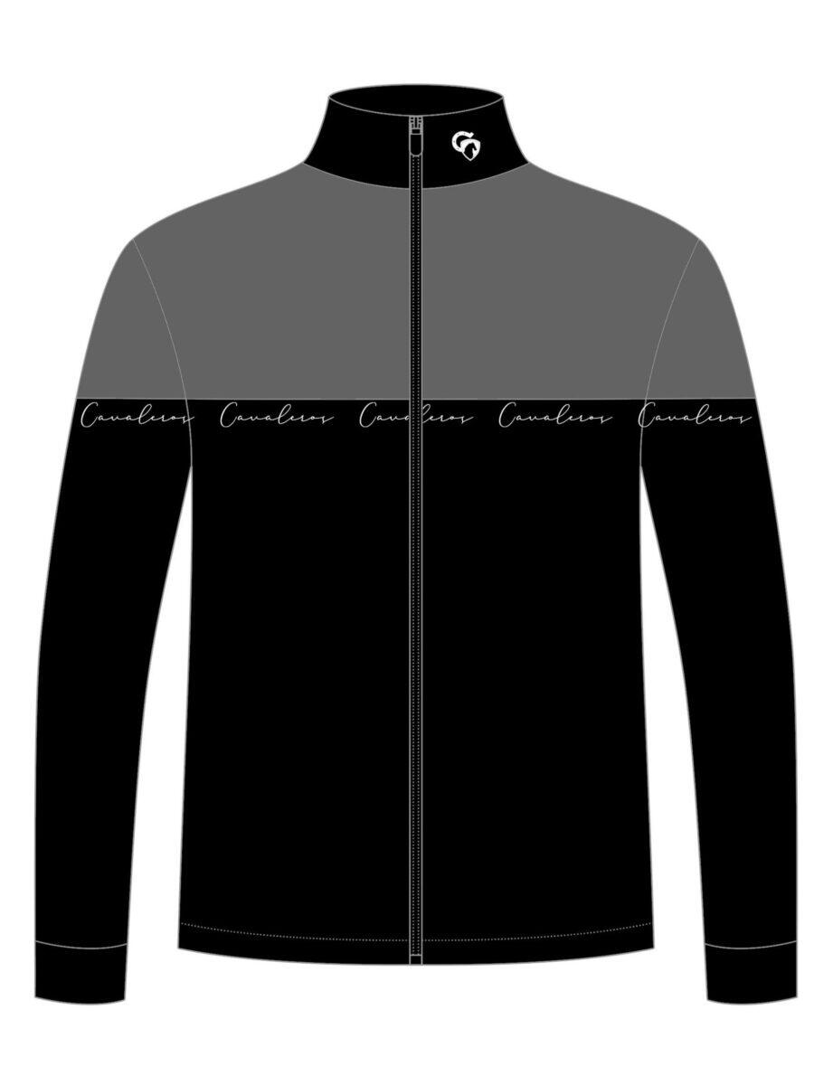 The jacket comes in 2 colors - the top is gray and the bottom is black. The collar of the jacket is black. Cavalero's logo in white italics in the black bottom of the jacket.
