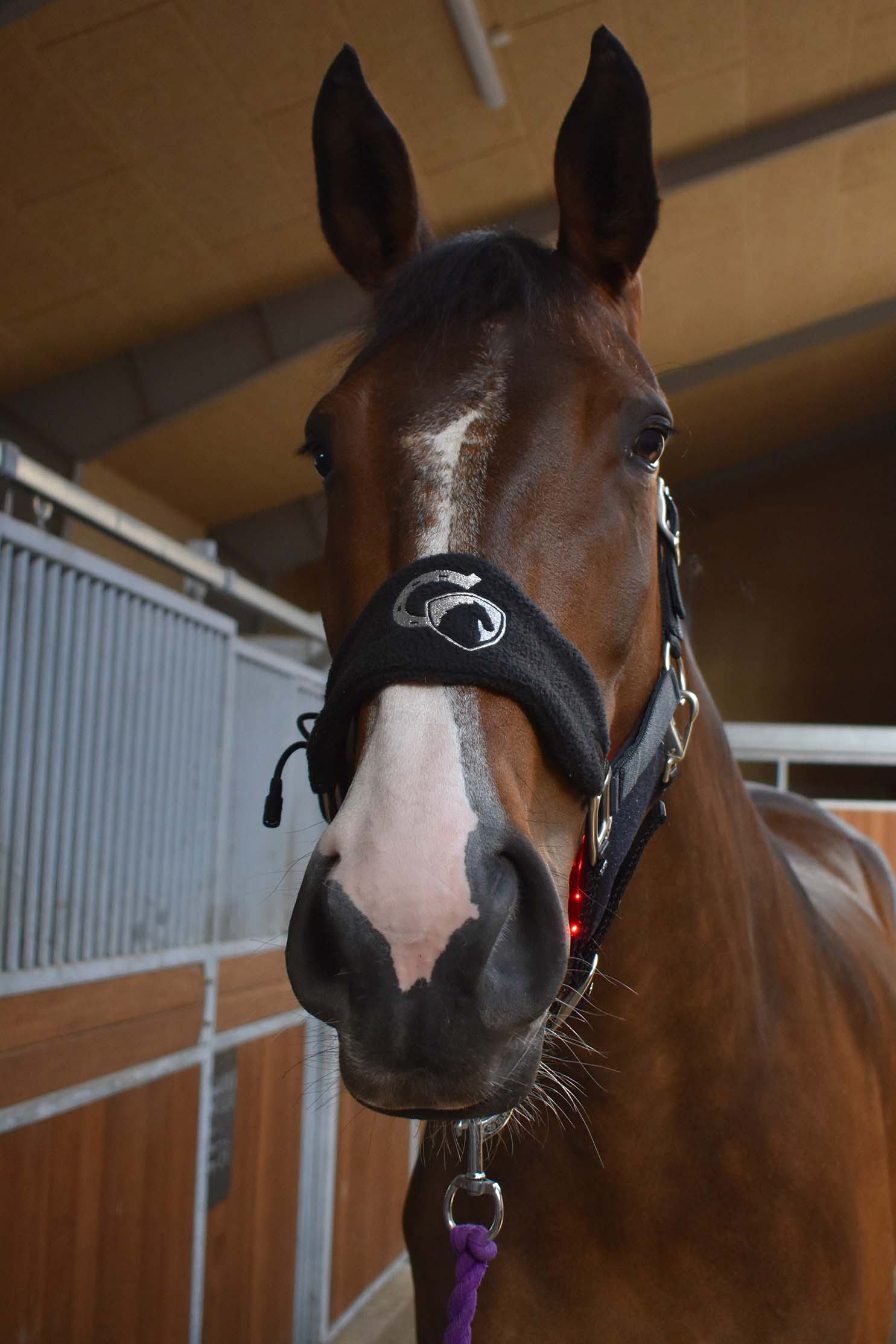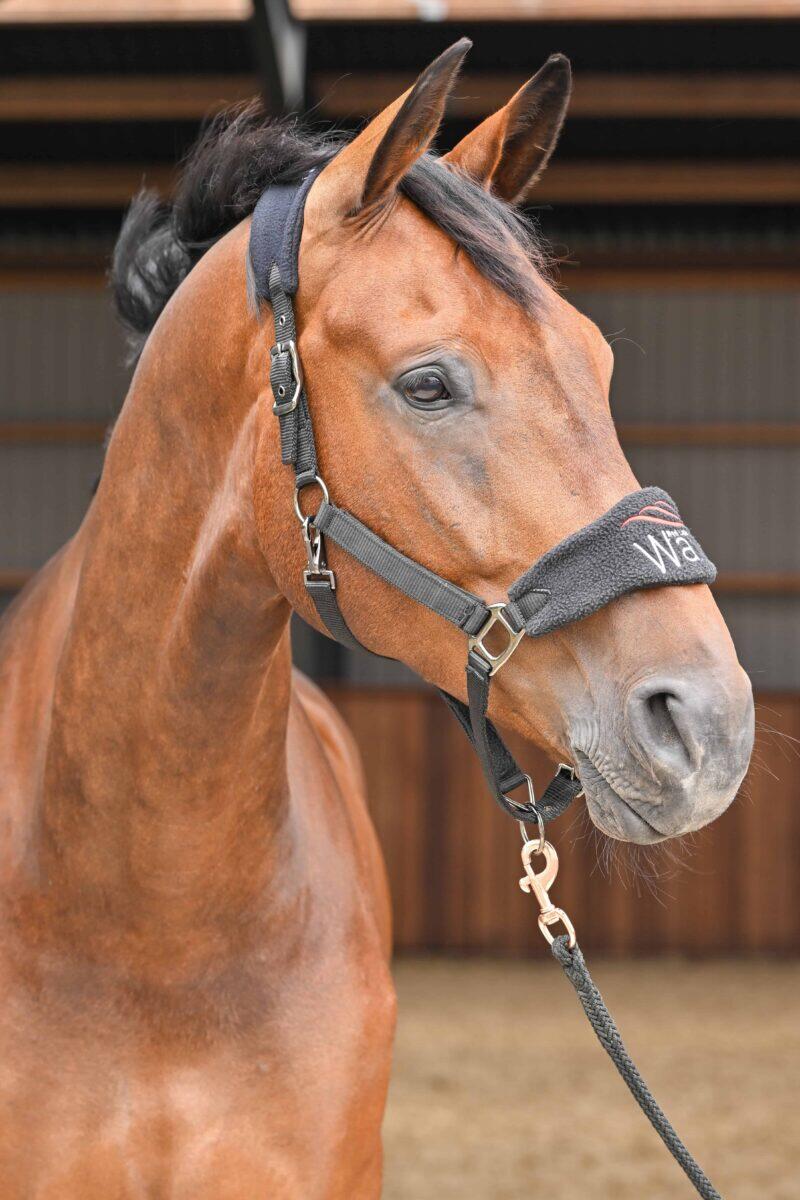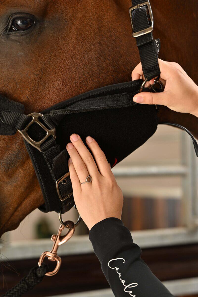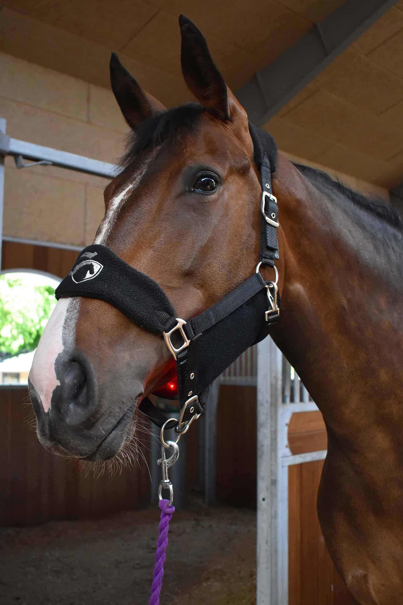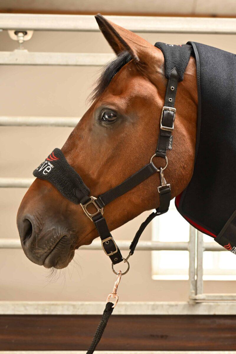 NOTE: New model of the halter with black buckles and the WAVE Red Light Therapy logo on the nosepiece.