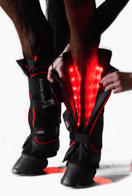 Maksimal Effektivitet: Lyset fra terapipadsene kommer helt tæt på hestens ben, hvilket optimerer behandlingen. Når WAVE RLT Therapy Boots IKKE anvendes i forbindelse med lysterapi behandling på hestens opstår der luftspalter på 2-3 cm mellem padden og hestens ben, hvilket svækker behandlingsresultaterne. Det skyldes, at WAVE RLT Therapy boots har to lange indbyggede velcrostriber, der sikrer, at WAVE RLT-padden sidder helt tæt i booten. Med tre elastiske stropper kan booten strammes, så lyset fra WAVE RLT-padden kommer helt tæt på hestens ben, hvilket resulterer i en markant forbedret behandlingseffekt.