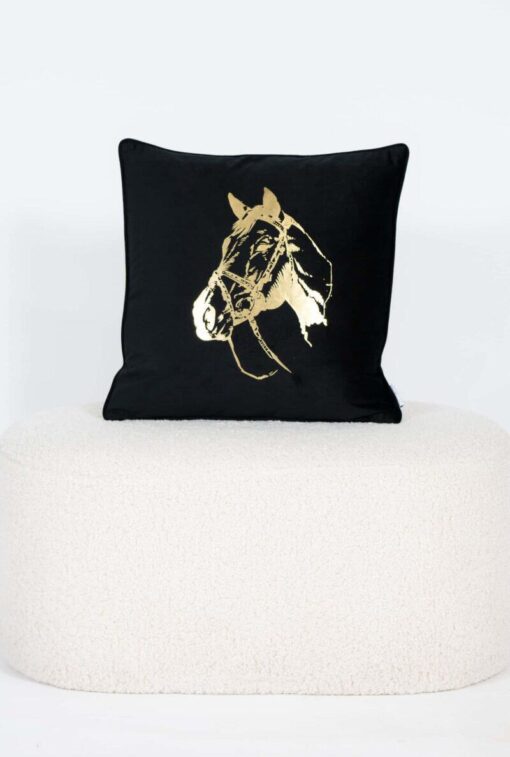 Tilfรธj et strejf af elegance og klassisk stil til dit hjem med vores smukke velourpude, dekoreret med et gyldent tryk af et hestehoved. Puden er fremstillet af tyk, blรธd velour, der ikke kun fรธles luksuriรธs, men ogsรฅ skaber en varm og indbydende atmosfรฆre.