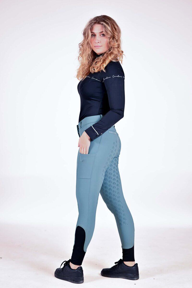 Stoffet er meget strรฆkbart i alle retninger og vi har lavet bukserne i et Slimfit der stortset passer alle, da stoffet former sig efter kroppen. Du fรฅr et par bukser som sidder til uden at du mister bevรฆgeligheden. Du vil opleve at du har meget stรธrre bevรฆgelighed end du er vant til. Nogle kalder dem "Tights med funktion af ridebukser". Vi har minimeret syningerne omkring anklen, og forlรฆnget lycra stoffet nederst sรฅ de ikke stumper pรฅ hรธje piger, og ikke bliver for lange til lidt kortere piger. Vores lommer er dybe og har elastik, sรฅ de godt kan rumme en stor mobil.
