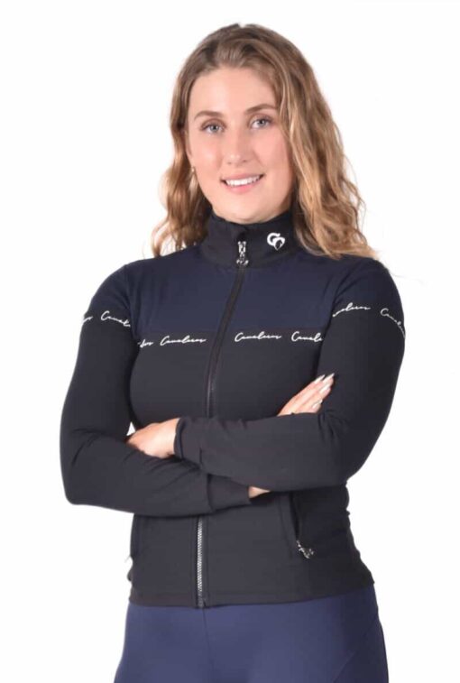 Jakken er i 2 farver - toppen er navy og bunden er sort . Jakkens krave er sort. Cavaleros logo i hvid skrรฅskrift i den sorte bund pรฅ jakken.